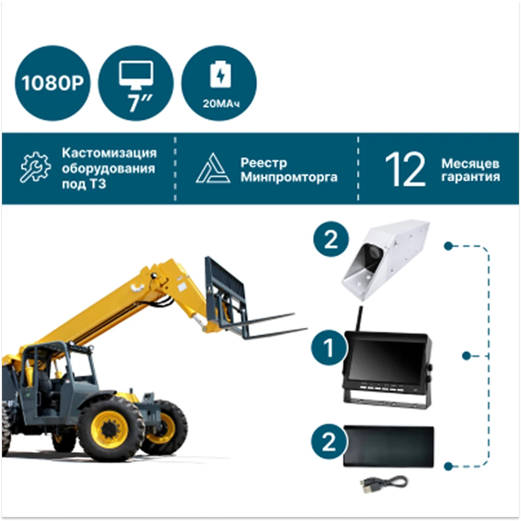 Беспроводной комплект на 2 камеры для вилочных телескопических погрузчиков NSCAR AE104 подходит для установки на различные виды погрузчиков и штаблеров.